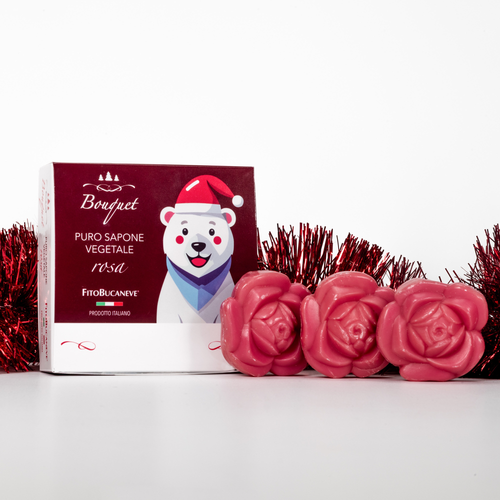 Bouquet Puro Sapone Vegetale Rosa è una saponetta a base di oli vegetali profumata dall'avvolgente fragranza di rosa. Per la sua particolare composizione è indicata per l'igiene delle pelli sensibili e delicate. La Glicerina contenuta, l'olio di Palma e l'olio di Palmisto ammorbidiscono, levigano, nutrono e proteggono la pelle.